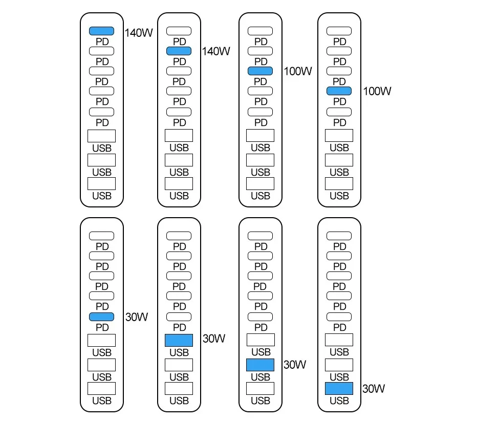 - Общее максимальное значение при использовании всех портов: 600W (макс).
