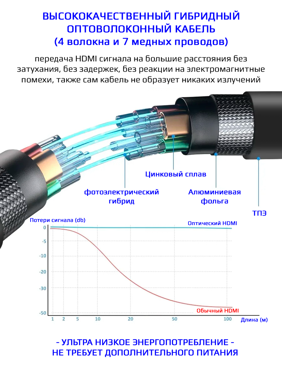Кабель HDMI v2.1 Optical UltraHD 8K 60Гц / 4K 120Гц, поддержка HDR, ARC, 48 Гбит/с, 2 метра, черный