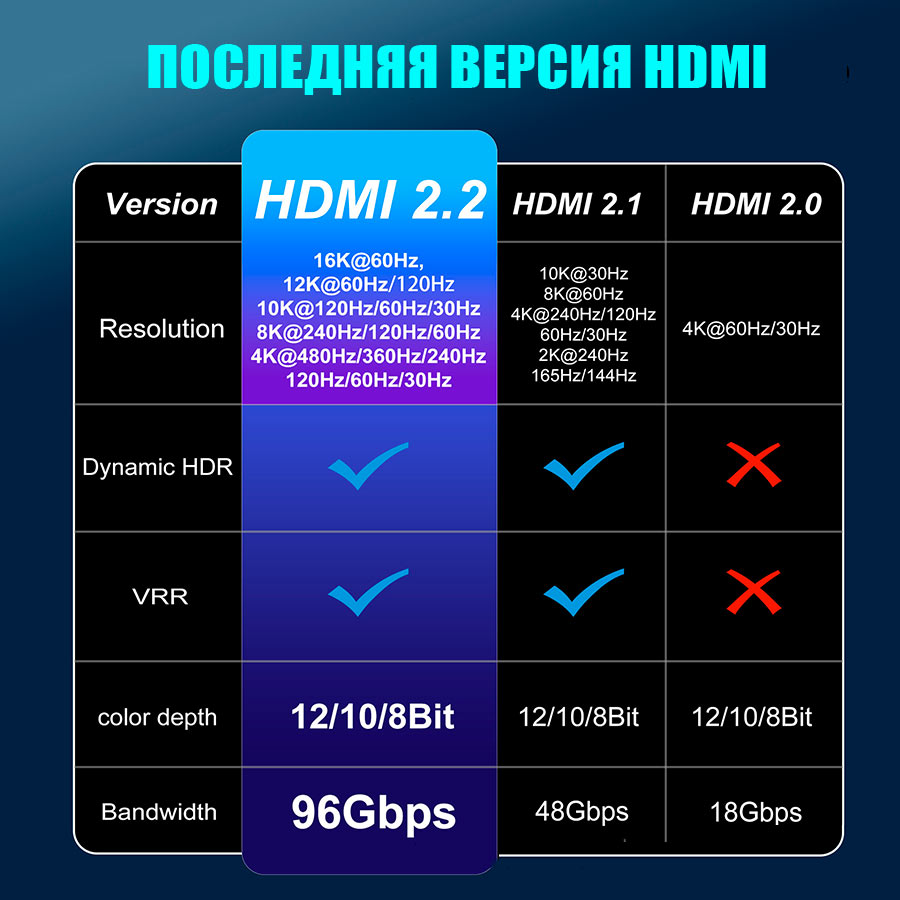 Кабель HDMI 2.2 - 16K 60Гц (DSC) / 8K 120Гц / 4K 240Гц, 96 Гбит/с, HDR, VRR, ARC/eARC, двойное экранирование, бескислородная медь, 2 метра