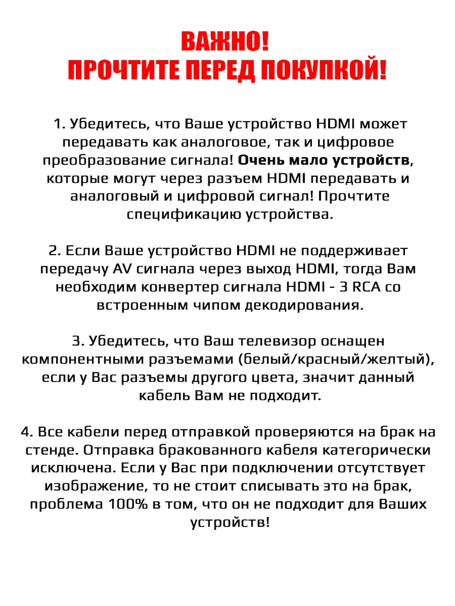 Данный кабель hdmi rca работает НЕ СО ВСЕМИ устройствами! Он работает как передатчик сигнала, но не как преобразователь или конвертер. Этот кабель с HDMI на RCA не имеет микросхем для преобразования цифровых сигналов в аналоговые. Подойдет только для HDMI устройств с чипом, который может преобразовывать цифровые сигналы в аналоговые. Также, он работает только в одну сторону - от Ашдимиай к RCA.