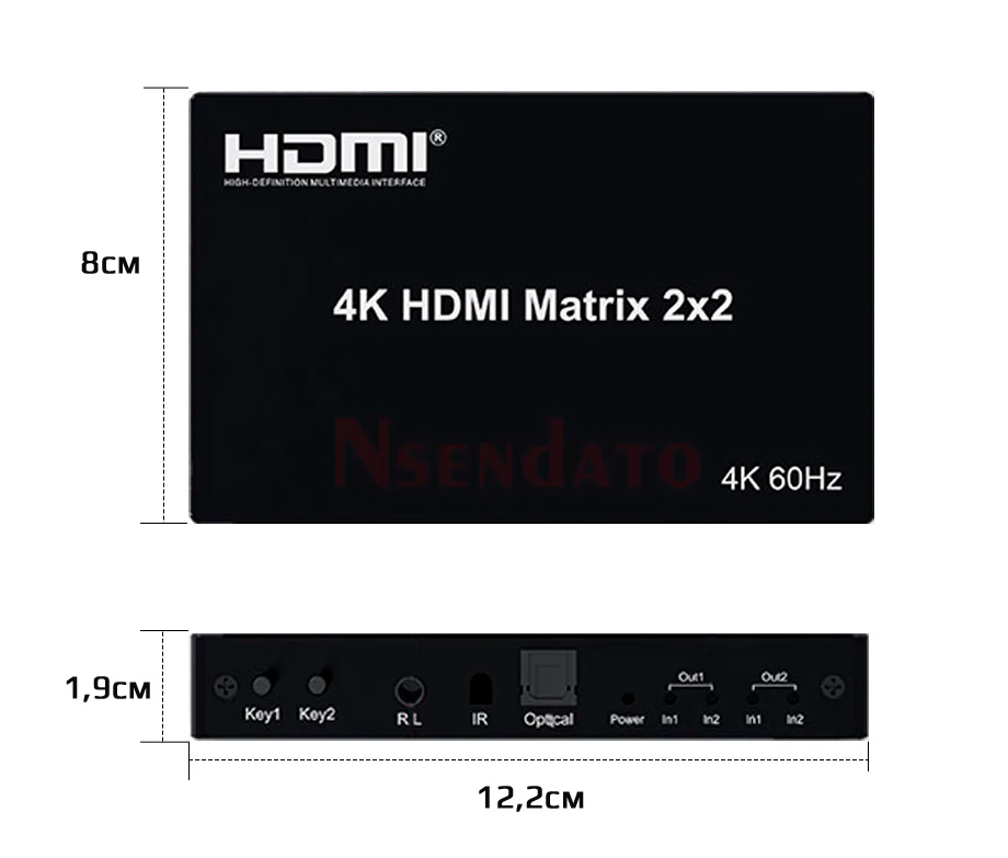 Матричный переключатель HDMI на 2 входа и 2 выхода позволяет одновременно подключать 2 устройства источника сигнала к 2-м дисплеям HDMI: телевизоры, мониторы, проекторы. Работает с помощью дистанционного ИК-пульта и кнопок на самом коммутаторе. Все дисплеи выводят одинаковое изображение из выбранного источника сигнала.