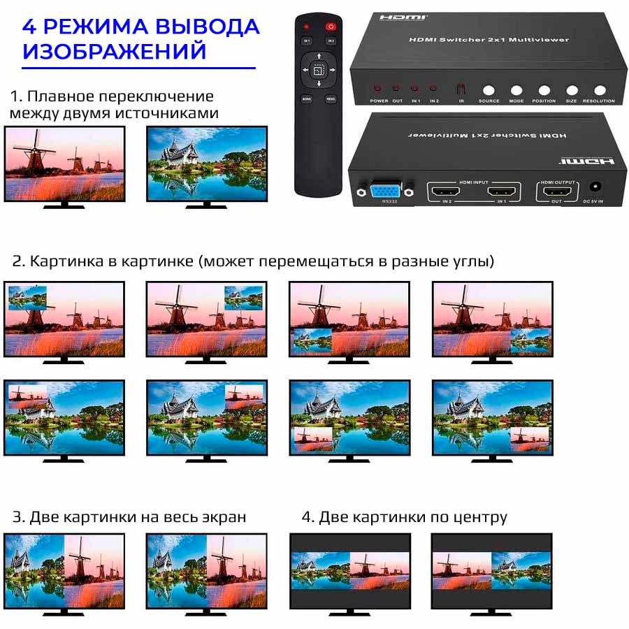 Опции переключаются с помощью пульта ДУ, ручного переключения кнопками на корпусе или с помощью ПК / ноутбука, который подключается к свитчу по разъему RS232.