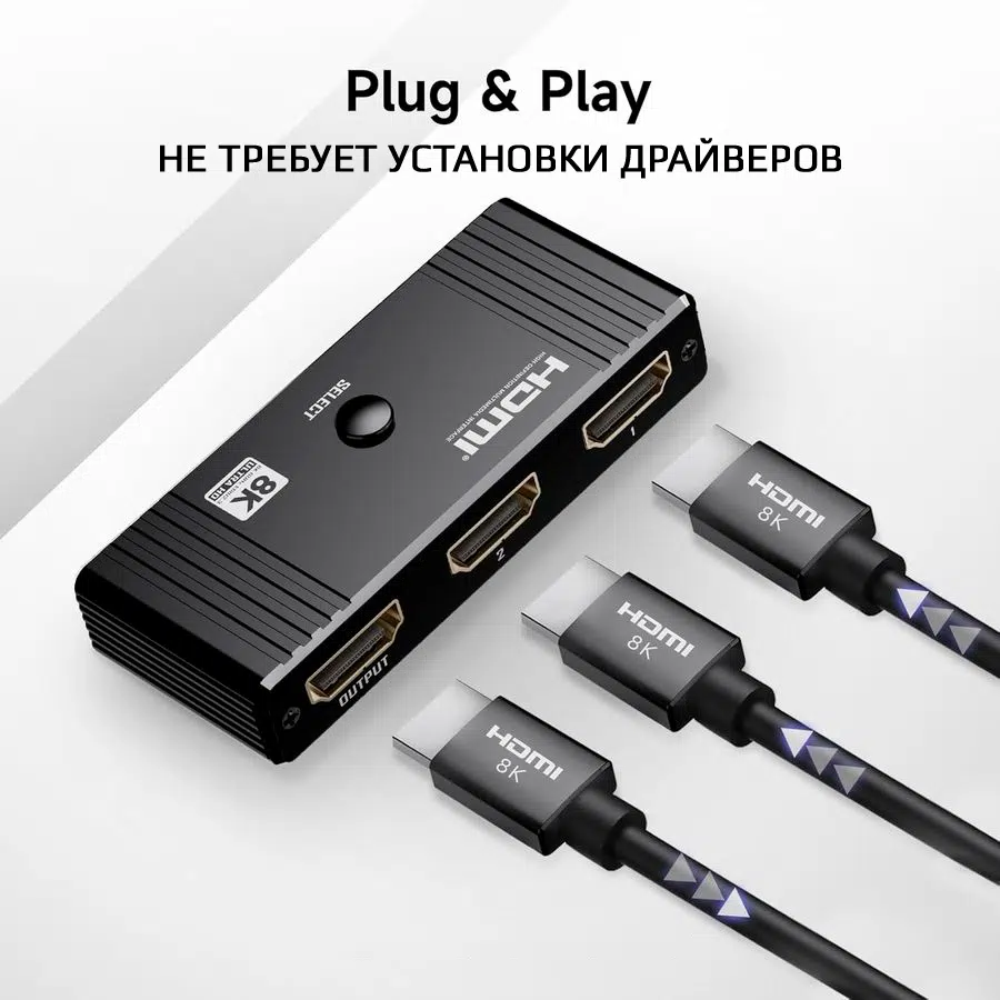Адаптер-переключатель HDMI 2×1 — это идеальное решение для тех, кто хочет максимально эффективно использовать свои устройства, обеспечивая легкий доступ к различным источникам видео без потери качества изображения.