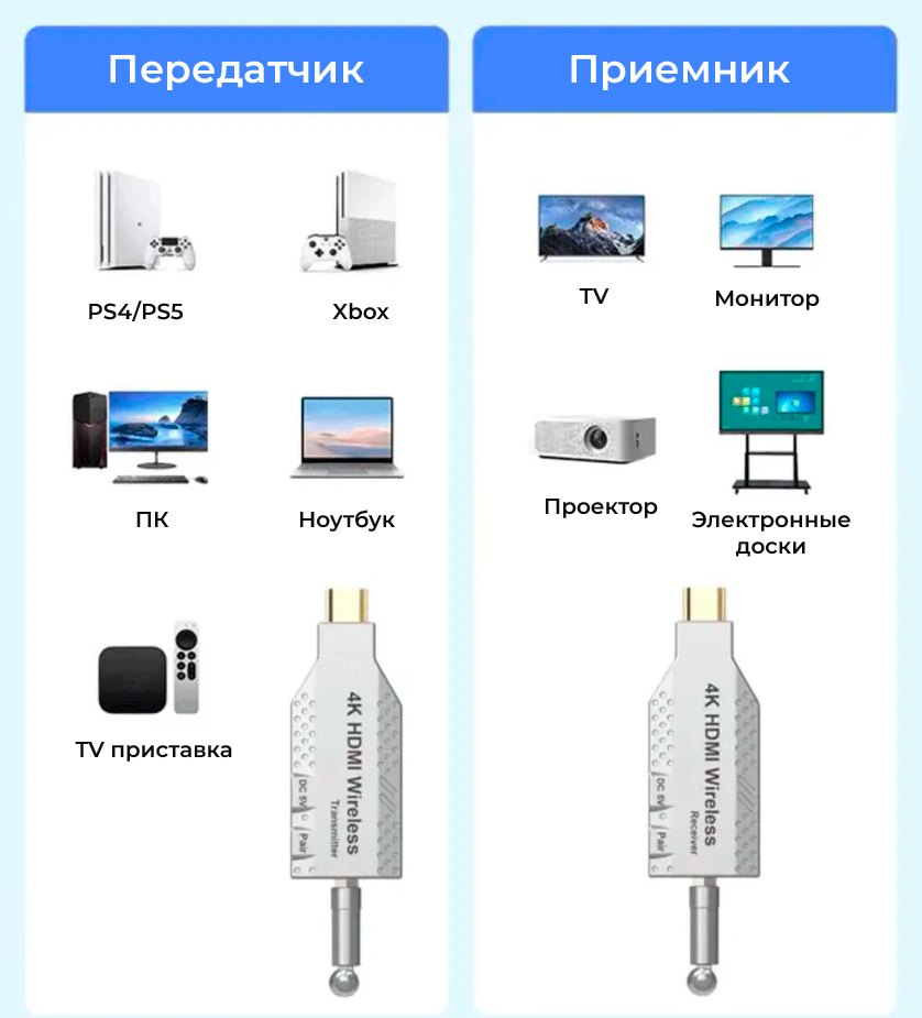 - Легкость установки: Установка не требует специальных навыков. Просто подключите передатчик к источнику сигнала и приемники к телевизорам или проектору — и вы готовы к работе!