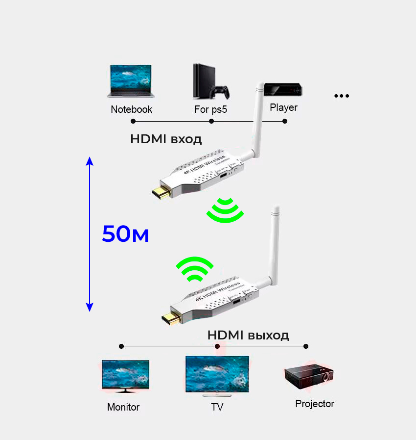 - Разрешение UHD 4K: Передатчик поддерживает передачу видео в формате 4K (3840х2160), что гарантирует яркое и детализированное изображение. Идеально подходит для фильмов, игр и презентаций.