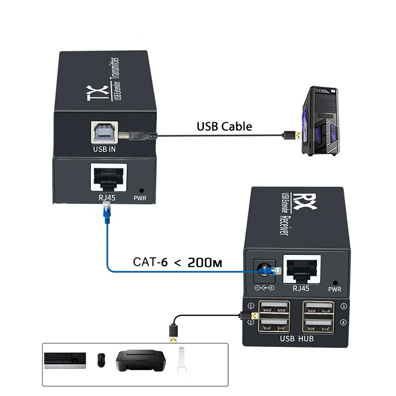 Комплект состоит из двух основных компонентов: передатчика (трансмиттера) и приемника. Передатчик подключается к вашему USB-устройству, например, клавиатуре, мыши, камере или принтеру, а приемник — к компьютеру или другому устройству приема сигнала. Между ними прокладывается стандартный сетевой кабель RJ45, который обеспечивает передачу данных на значительные расстояния без потери качества и скорости.