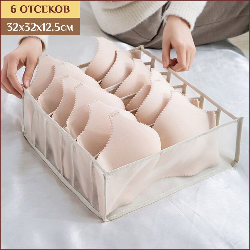 Органайзер для шкафа или комода - коробка для хранения одежды (нижнего белья, вещей), размер 32х32х12,5см, 6 отсеков, белый
