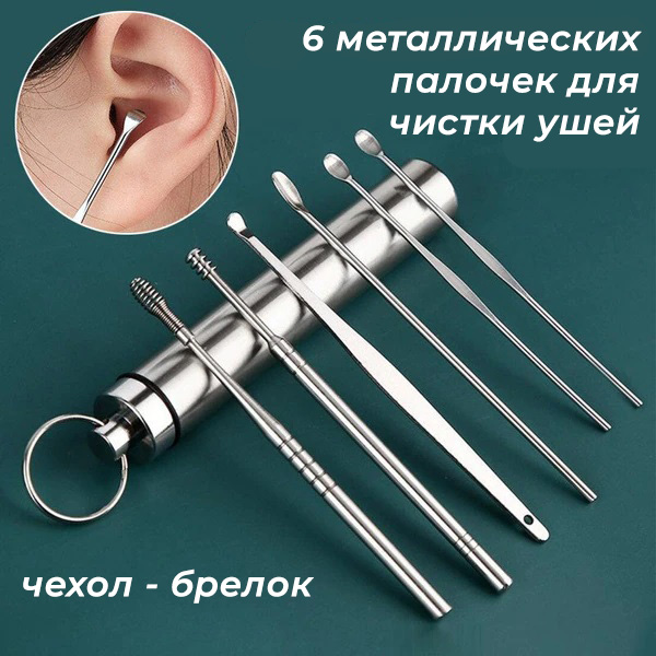 Набор инструментов для чистки ушей - ушные палочки - металлическая ухочистка MOD02, нержавеющая сталь, 6 штук