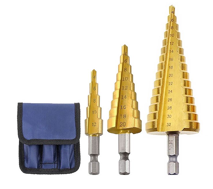 Набор ступенчатых сверл 4-12, 4-20, 4-32 мм с титановым покрытием по металлу, 3 штуки, золотой