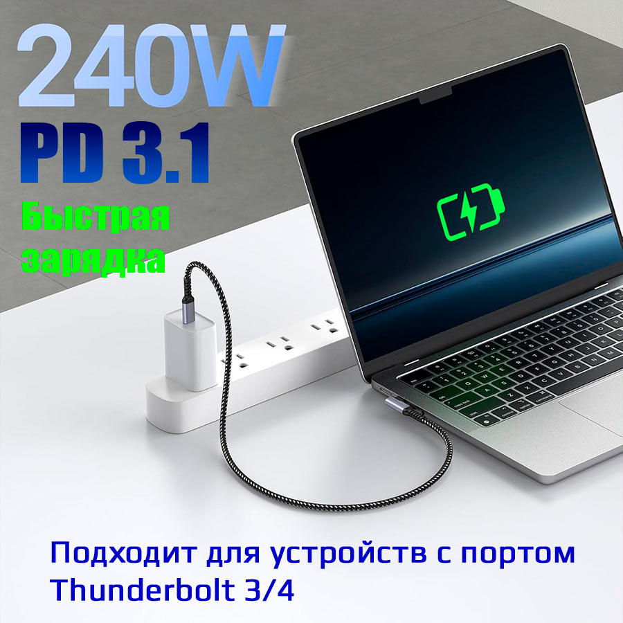 - Ультимативная мощность 240W: Поддержка стандарта PD 3.1 (48V/5A). Кабель способен зарядить любое современное устройство — от флагманских смартфонов до самых мощных игровых ноутбуков.