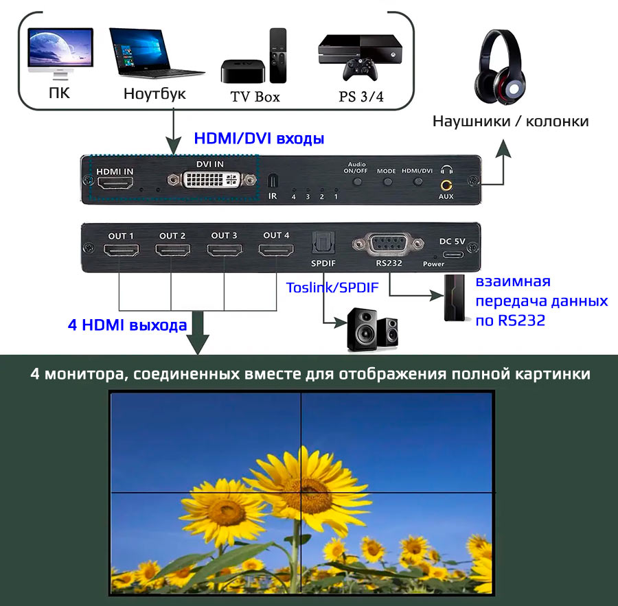 Подключение до 4 экранов: Гибкая конфигурация 2x2 позволяет вам настроить видеостену под любые задачи и пространства, обеспечивая эффектный визуальный ряд. Возможны 8 способов деления экрана, а также вращение на 180 градусов.