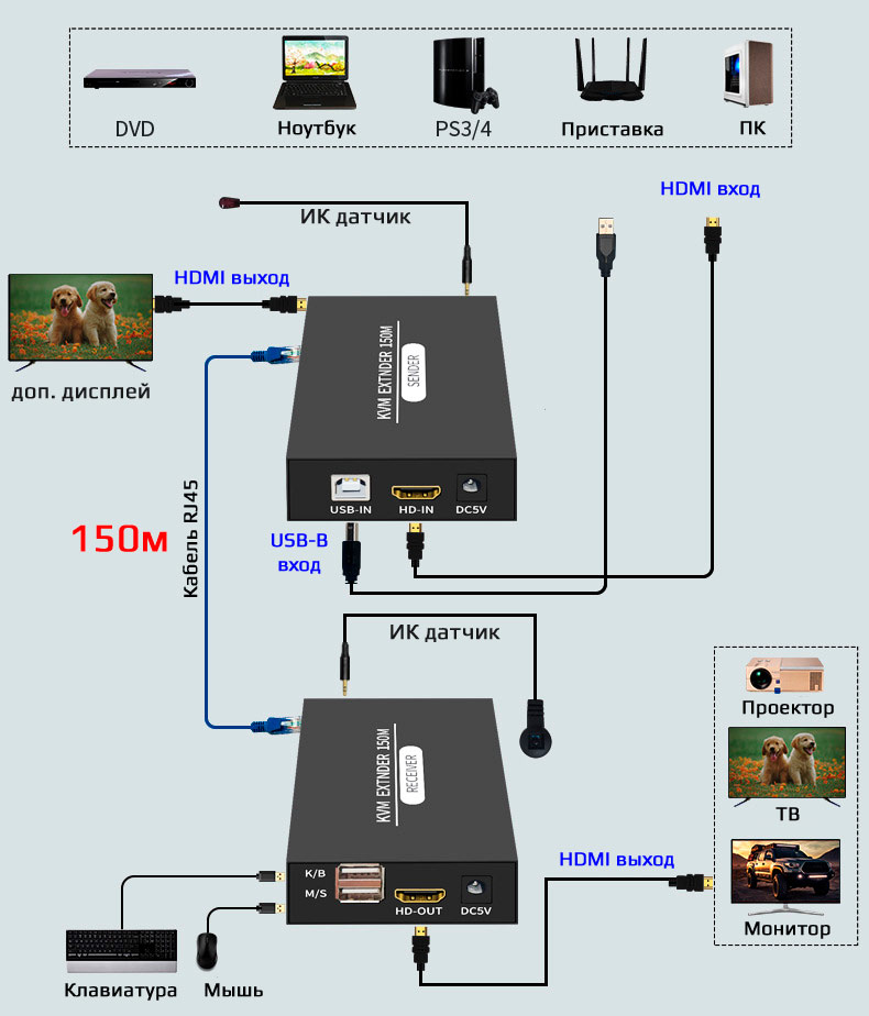- передатчик сигнала (Sender) имеет дополнительный HDMI выход;