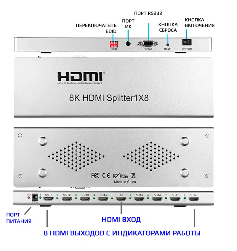 - Высокая пропускная способность - даже для 4K/HDR/Dolby Vision сплиттер не станет "бутылочным горлышком", в отличие от старых моделей (HDMI 2.0, 18 Гбит/с).