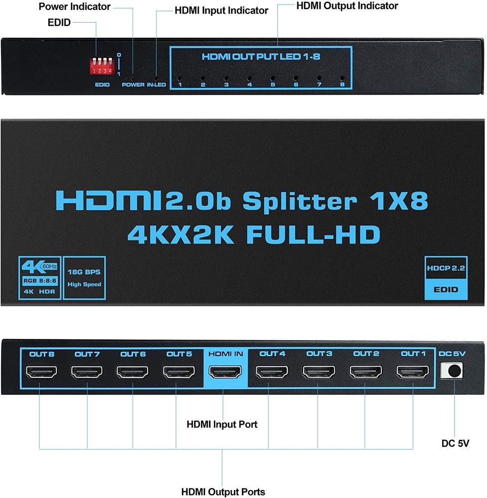 - Подключение до 8 устройств: Один HDMI-вход и 8 HDMI-выходов позволяют легко распределять сигнал на множество дисплеев.
