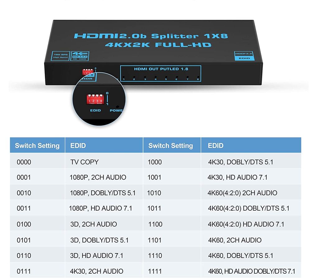 Сплиттер HDMI 1×8 — это отличное решение для тех, кто ищет надежный способ распределения видеосигнала на несколько экранов, сохраняя при этом высокое качество изображения и звука.