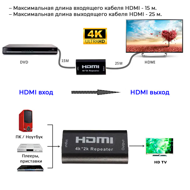– Максимальная длина выходящего кабеля HDMI: 25 м.