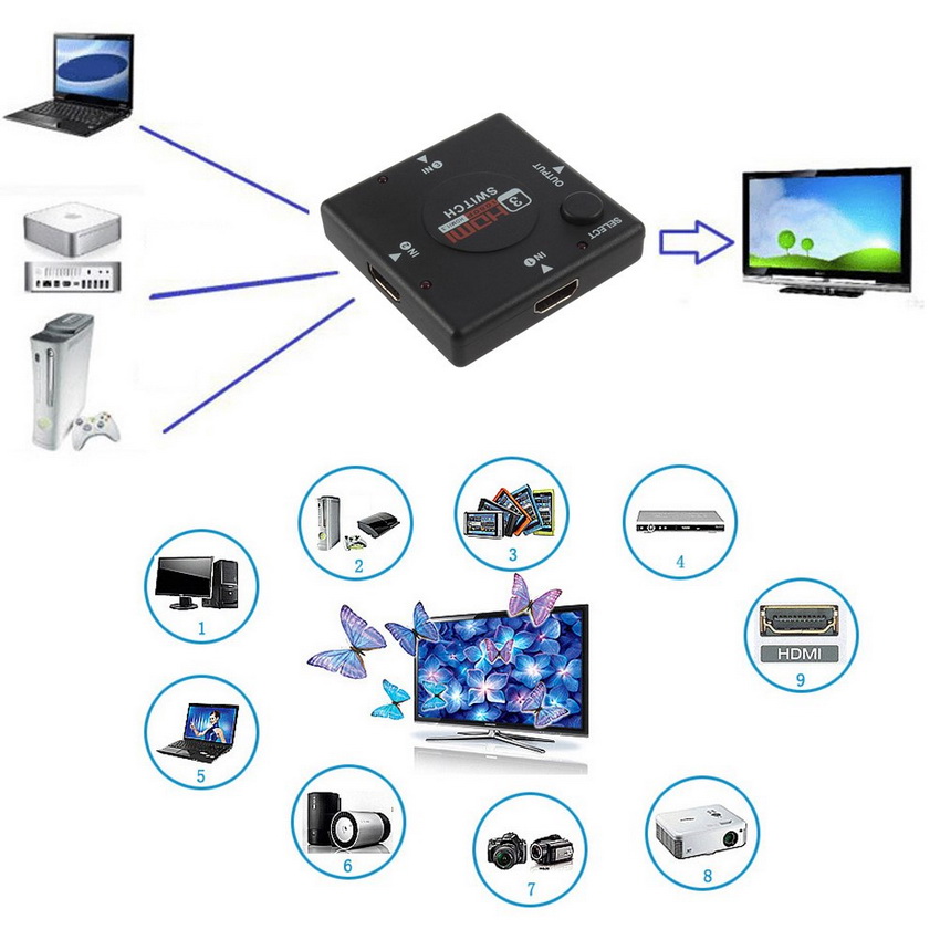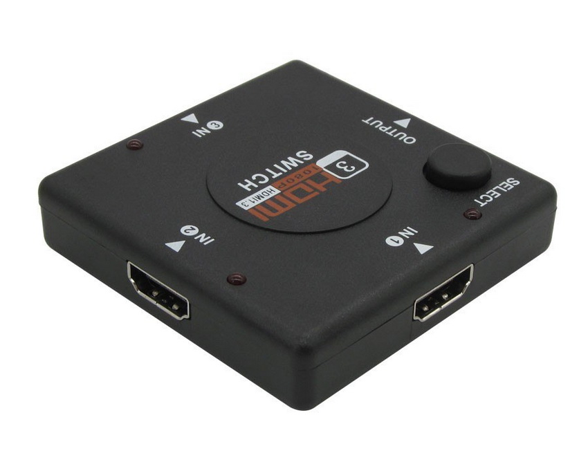 Адаптер / переключатель / свитч 3×1 HDMI FullHD 1080p 3D – для подключения до 3-х источников сигнала к одному дисплею: телевизору, монитору, проектору. Адаптер имеет клавишу SELECT для переключения каналов – ручное управление. Свитч подключается к большинству устройств с интерфейсом HDMI, таким как проигрыватель DVD / Blu-ray, Xbox, Sony PS3/PS4, компьютер, ноутбук, телевизионная приставка, спутниковый ресивер и др. Поддержка разрешение до FullHD 1920х1080, поддержка 3D и цифрового звука из выбранного источника.