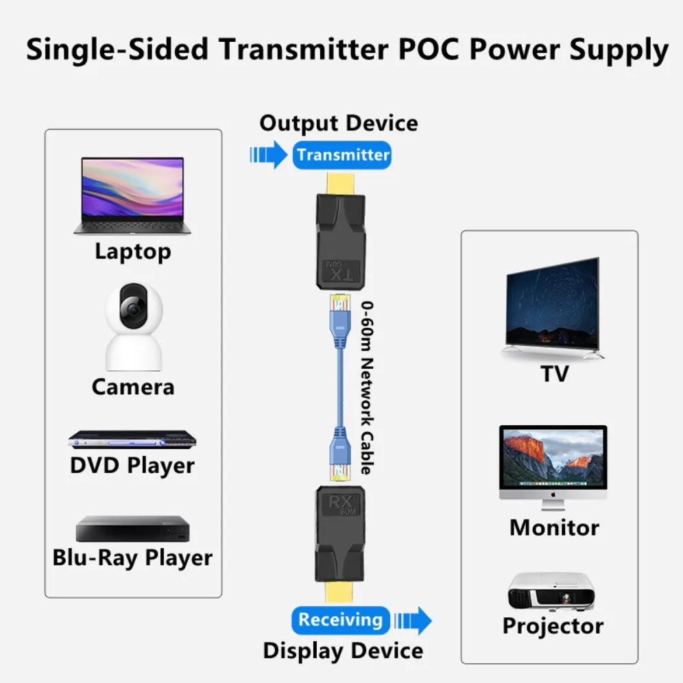 Для оптимальной работы рекомендуется использовать кабели RJ45 (LAN) Cat-5e или Cat-6. С этим активным удлинителем сигнала HDMI вы сможете легко подключать устройства на расстоянии до 60 метров, не теряя в качестве изображения (если использовать витую пару Cat-6).