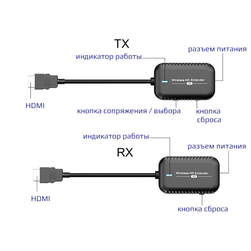 Передатчик (TX) подключается к порту HDMI на ПК, ноутбуке, видеокамере, PS 3/4 и др. устройствам. Приемник (RX) подключается к портам HDMI на HD телевизоре, проекторе, мониторе.