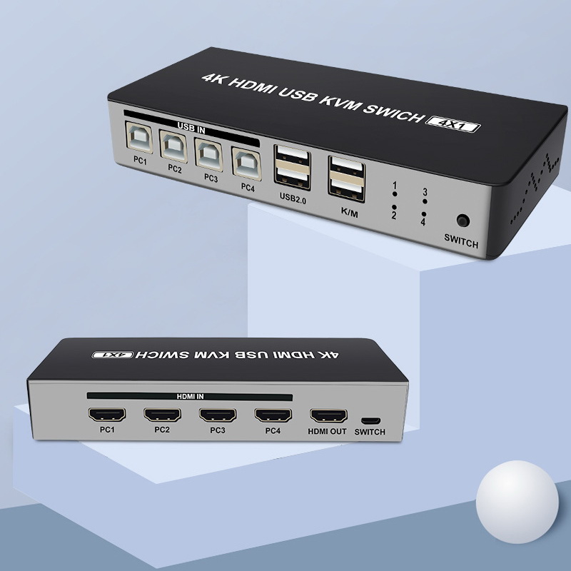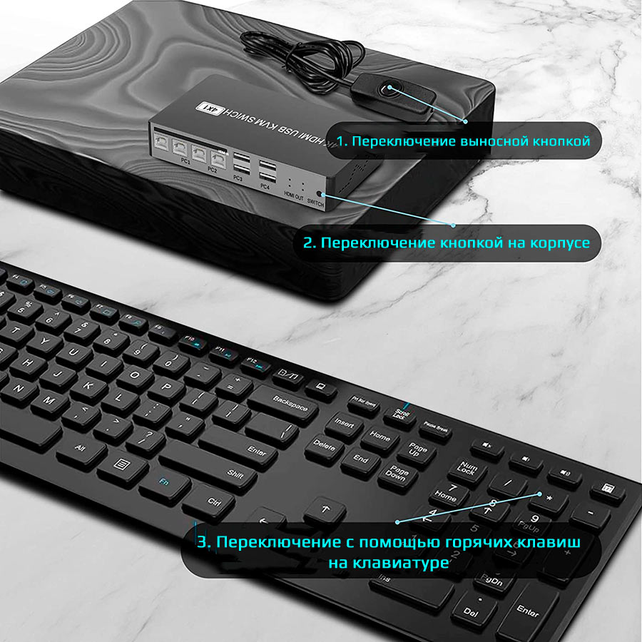 Данный KVM-переключатель позволяет управлять четырьмя устройствами с HDMI и USB портами (например, компьютерами и ноутбуками) с помощью одного дисплея, клавиатуры и мыши (в том числе беспроводных). Переключение между устройствами осуществляется как с кнопки на корпусе, так и с помощью выносной кнопки. Дополнительные порты USB 2.0 предоставляют возможность подключения принтера, сканера, флешки и других устройств.