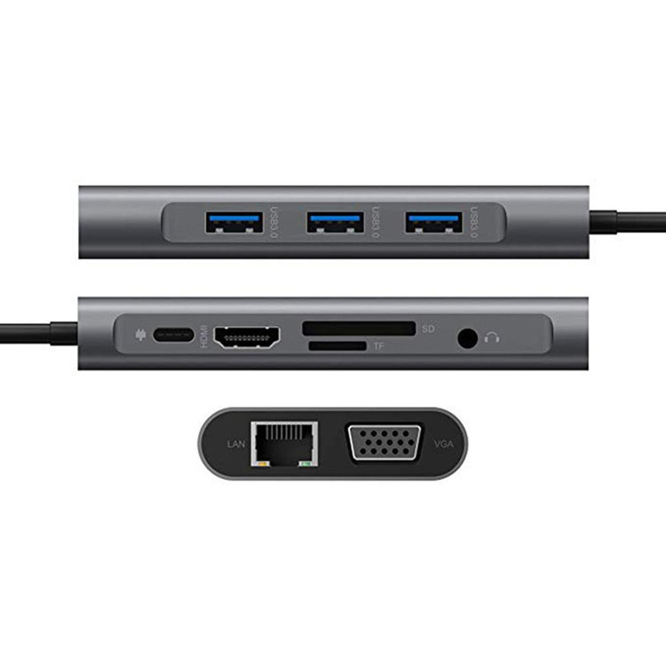 Адаптер USB3.1 Type-C – HDMI / VGA / 2xUSB3.0 / RJ45 / аудио jack 3,5mm / картридер SD позволяет расширить возможности USB3.1 Type-C порта и подключить Ethernet-соединение к Вашему компьютеру, ноутбуку или планшету через сетевой разъем RJ45 (до 1000 Мбит/с). Порт HDMI / VGA предназначен для передачи изображения со смартфона, планшета, ноутбука или компьютера с порта USB-C на телевизор, монитор или проектор со входом HDMI / VGA. Порты HDMI и VGA могут работать одновременно. Конвертер позволяет дублировать или расширить пространство рабочего стола Вашего ПК или ноутбука на дополнительный монитор, телевизор, проектор. Также возможно подключение периферийных устройств: флешка, внешний жесткий диск, картридер, клавиатура, мышь, др. адаптер / хаб, web-камера, принтер, сканер, МФУ и т.п. Также адаптер поддерживает чтение карт памяти стандарта SD и имеет отдельное гнездо jack 3.5mm для вывода звука.