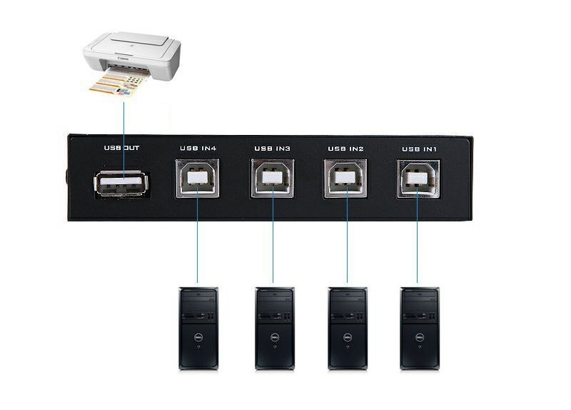 Адаптер / переключатель / свитч USB2.0 предназначен для подсоединения четырех компьютеров или ноутбуков к одному принтеру, сканеру, плоттеру, МФУ и др. устройствам.