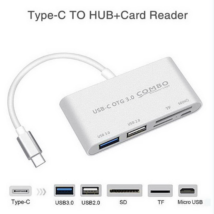 Адаптер USB3.1 Type-C – USB2.0 / USB3.0 / картридер TF/SD предназначен для подключения периферийных устройств к смартфону, планшету, ноутбуку или компьютеру через порт USB 2.0/3.0: флешка, внешний жесткий диск, картридер, клавиатура, мышь, др. адаптер / хаб, web-камера, принтер, сканер, МФУ и т.п. Также адаптер поддерживает чтение карт памяти стандарта SD и TF.