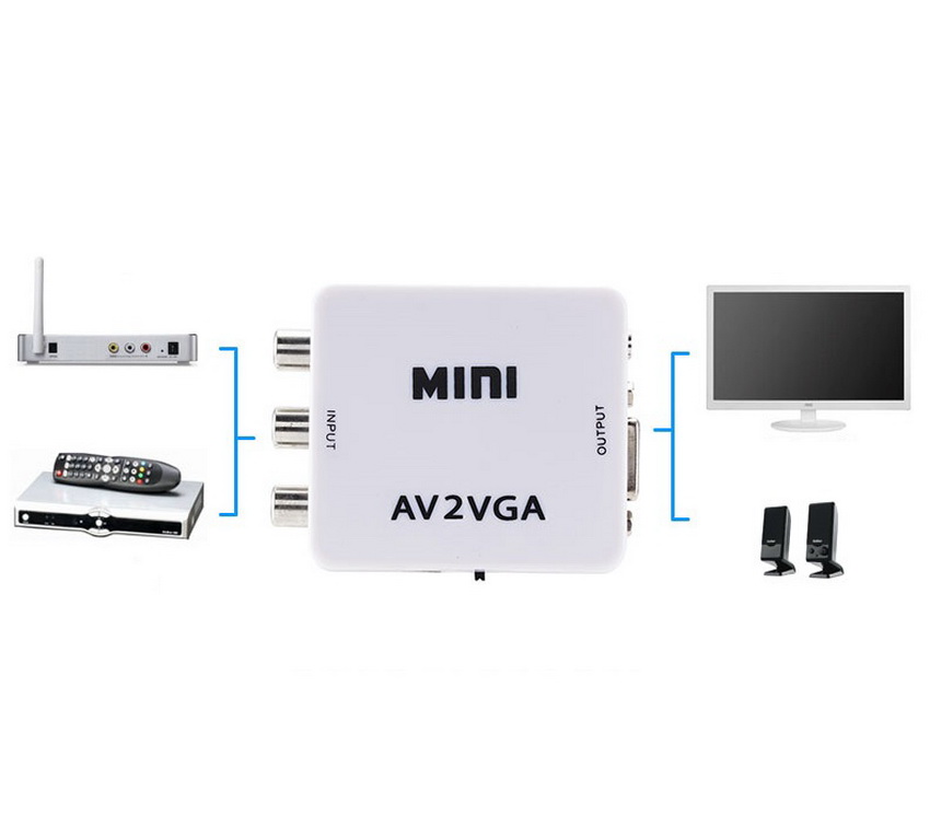 Адаптер / переходник / конвертер / преобразователь AV (3x RCA, тюльпаны) на VGA – преобразует композитный CVBS видеосигнал и стерео аудио сигнал FL/FR в аналоговый VGA сигнал и аудио jack 3.5mm (только в этом направлении), поможет подключить DVD и Blu-Ray – проигрыватель, игровую приставку типа Dendy или SEGA, видеокамеру и др. технику с выходом AV (3x RCA / тюльпаны) к телевизору, монитору, проектору с портом VGA.