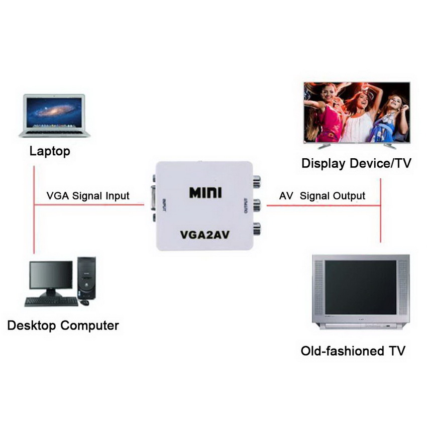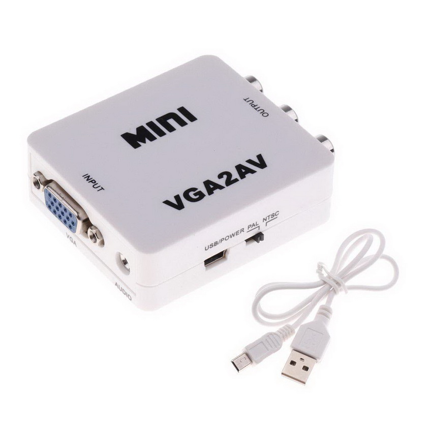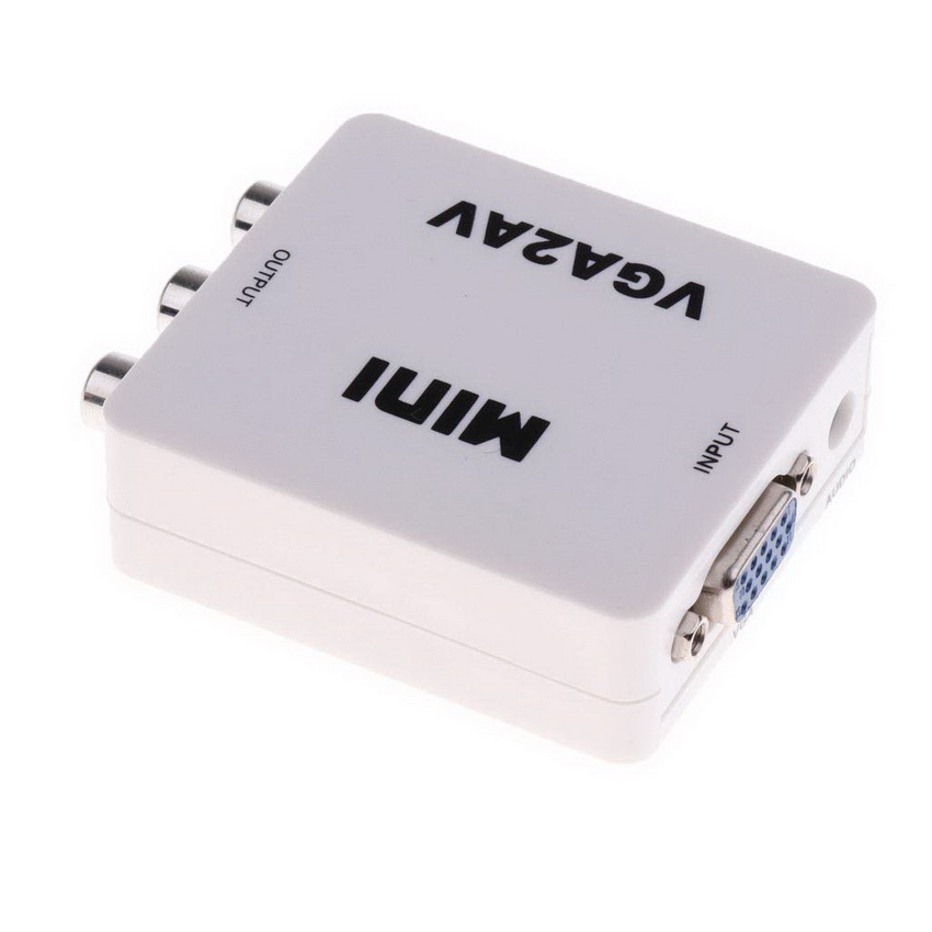Адаптер / переходник / конвертер / преобразователь VGA – AV (3x RCA, тюльпаны) – преобразует аналоговый VGA сигнал и аудио jack 3.5mm в композитный (CVBS) видеосигнал и стерео аудио сигнал FL/FR (только в этом направлении), поможет подключить компьютер, ноутбук, DVD-плеер, игровую консоль и др. технику с выходом VGA к телевизору, дисплею с портом AV (3x RCA / тюльпаны).